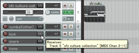 少し工夫して、音源を読み込むトラックとMIDIを打ち込むトラックを分け、MIDIの方でチャンネルごとに「チャンネル2はキックのトラックに送る」「チャンネル3はスネアのトラックに」とトラックI/Oで設定すると、MIDIファイルは一つですむ。しかしMIDI打ち込みの際、楽器ごとにチャンネルを切り替えねばならず、効率的にもう一歩である。