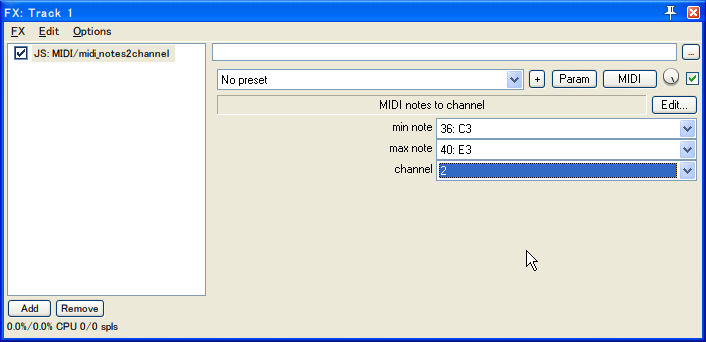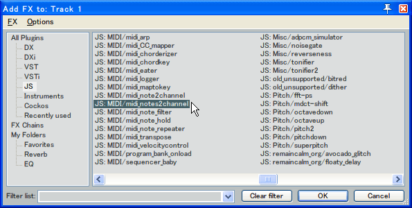 以下のJSスクリプトを、<Reaperインストールフォルダ\Effects\MIDI\midi_notes2channel>に配置すると、FXを追加する画面の「JS」に「JS:MIDI/midi_notes2channel」が追加されている。