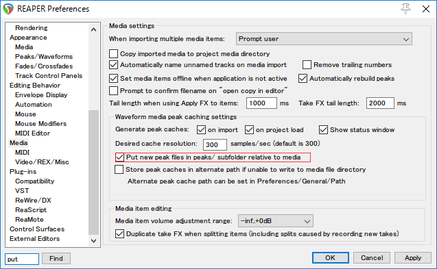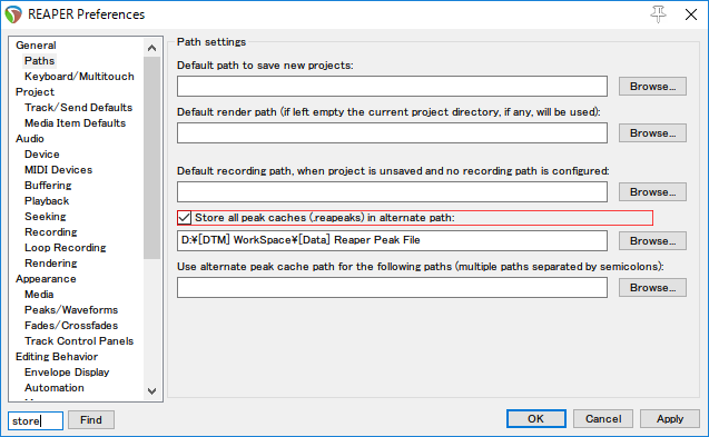 [Preferences]→[General/Paths]→[Store all peak caches (.reapeaks) in alternate path:] にチェック