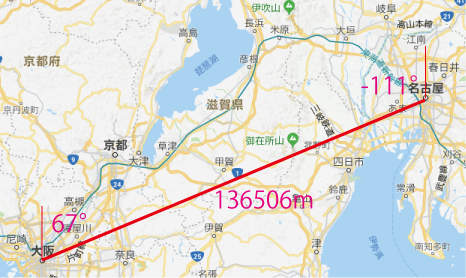 import pyproj grs80 = pyproj.Geod(ellps='GRS80') # GRS80楕円体 lat1, lng1 = 34.705185, 135.498468 # 梅田駅 lat2, lng2 = 35.170897, 136.881537 # 名古屋駅 azimuth, bkw_azimuth, distance = grs80.inv(lng1, lat1, lng2, lat2) print(azimuth, bkw_azimuth, distance) # => 67.36528283503415 -111.84261446690202 136506.23110143896
