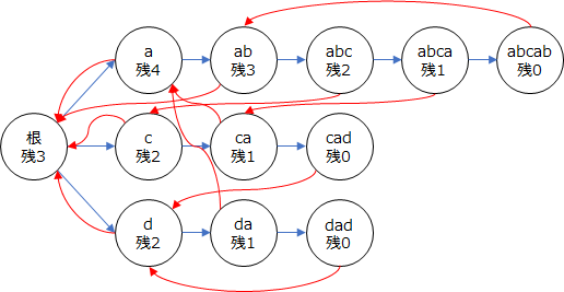 上記の例なら、'abcabcd' のsuffixリンクが 'abcd' に張られているので、そこでコスト計算することができる。