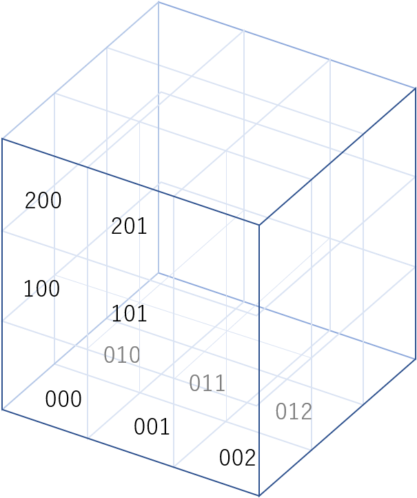 つまり、(Aの添字を3進法で表して)$A_{100}-A_{000}$ は、一番上の層だけを2次元で解く問題における $A_{00}$(元 200 の位置)の値となる。