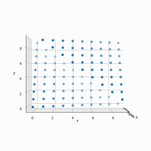 - $xy$ 平面に投影しても、$yz$ 平面に投影しても、$zx$ 平面に投影しても、どの立方体も隠れない。