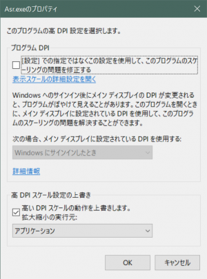 Asr.exeのプロパティから、「互換性」タブ→「高DPI設定の変更」へ進む。